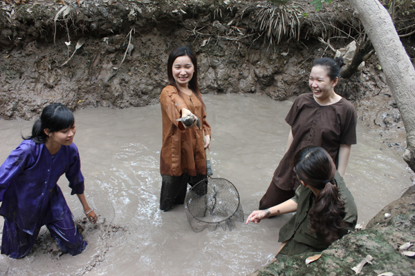 Đến khu du lịch Vinh Sang . Quý khách sẽ nhận và thay trang phục "quần áo bà ba" để tham gia chương trình " Tát Mương Bắt Cá ", quý khách sẽ tự tay mình bắt được những chú cá như : Cá lóc, cá trê, tôm, cua, ốc có trong mương và tự tay chế biến món cá mướng bằng cách nướng trui và thưởng thức ngay tại vườn cùng với bánh tráng, rau sống, trái cây . Mỗi một xe là một đội , đội nào bắt hết số cá trong ao trong thời gian sớm nhất sẽ là đội thắng cuộc . Và nhận được phần quà của ban tổ chức
